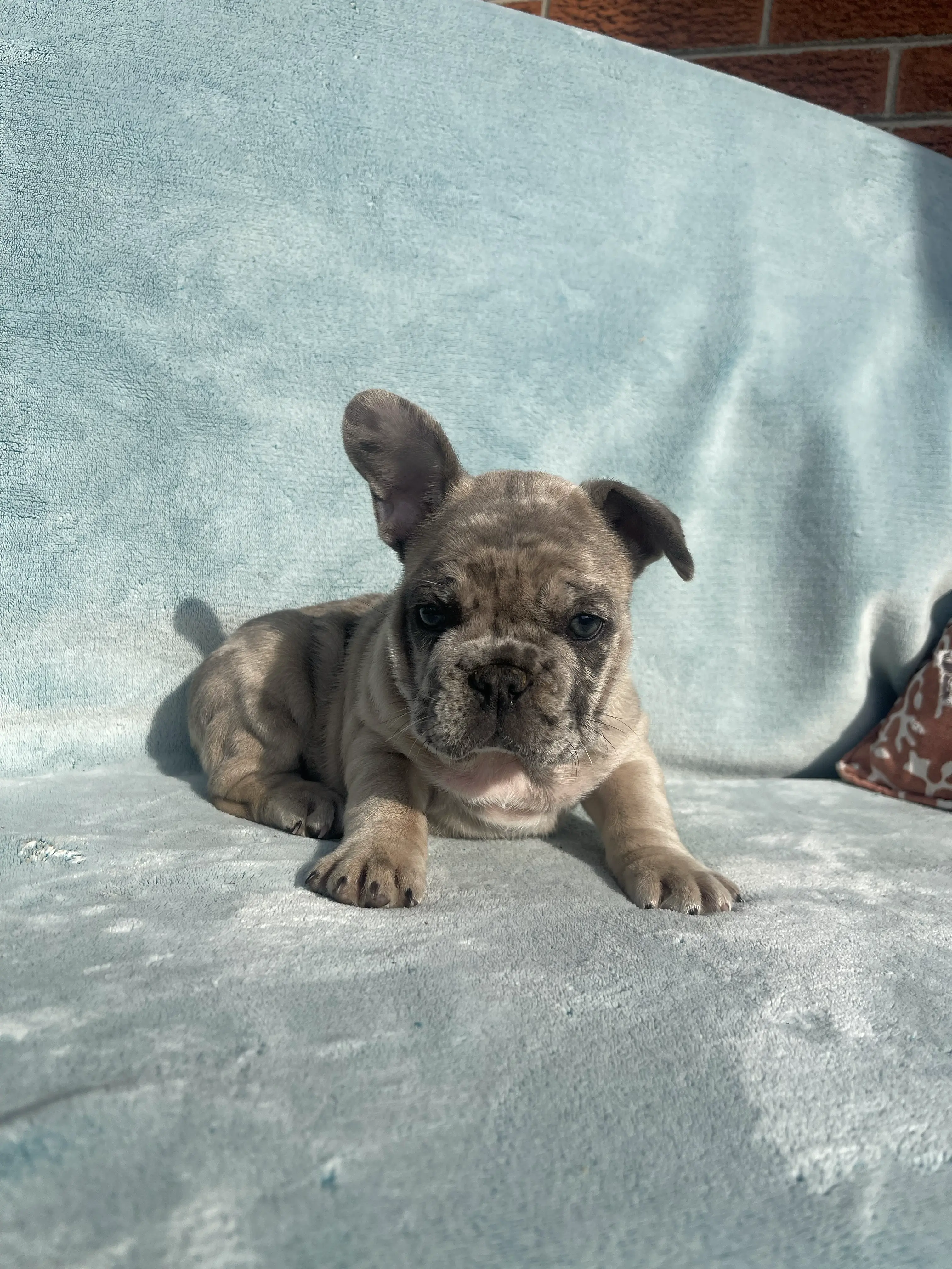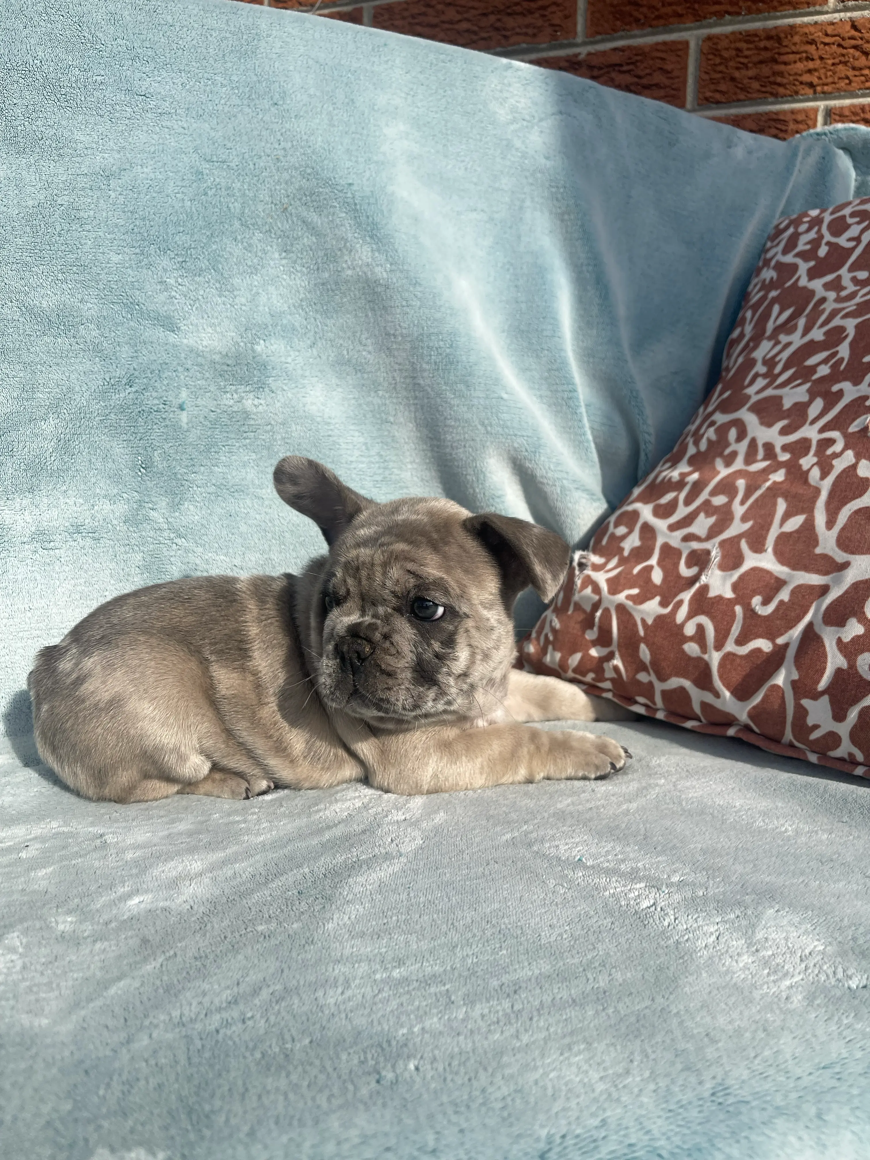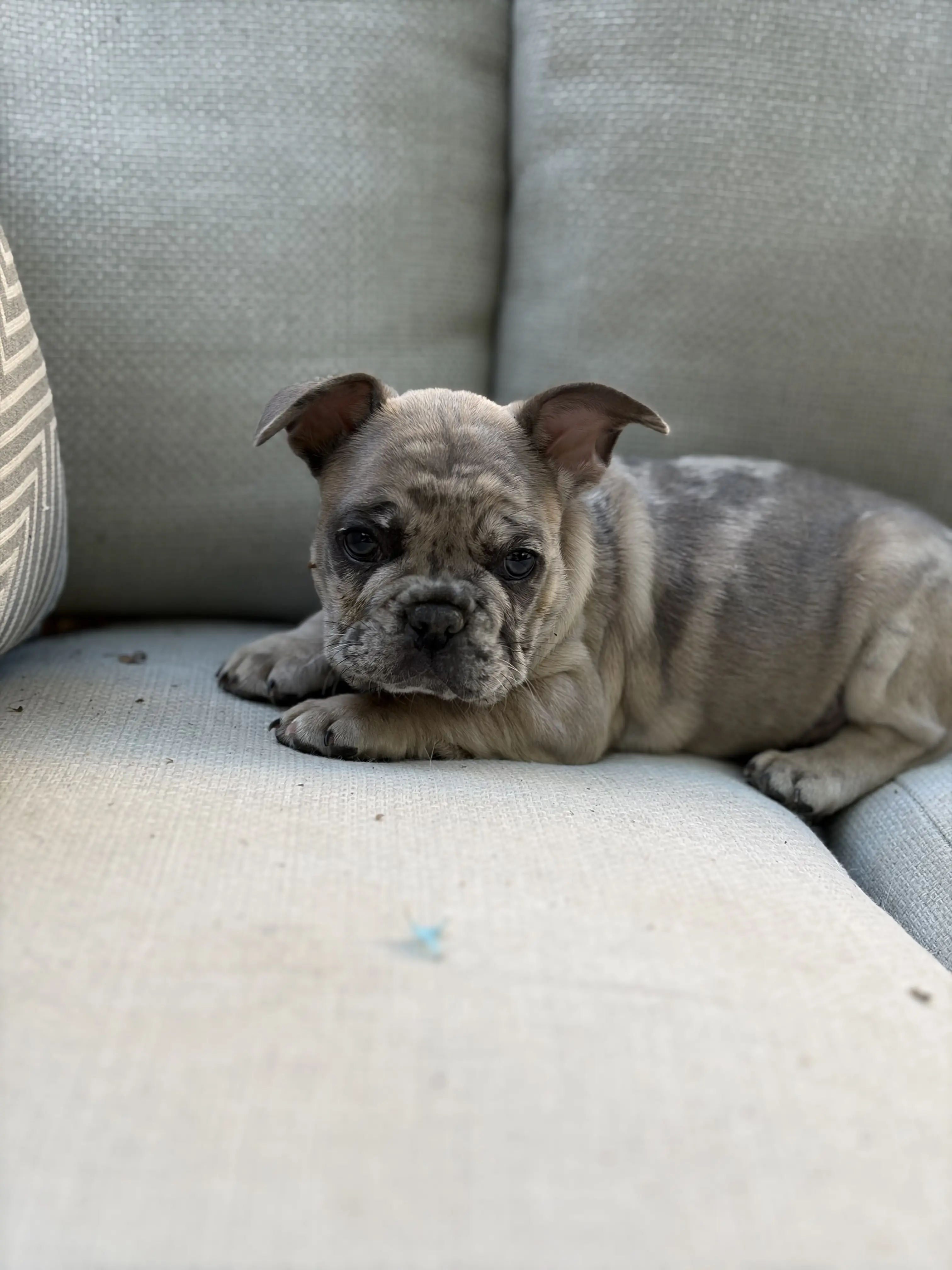 Winnie is pure sunshine wrapped in a chunky Blue Fawn Merle package. He’s the first to waddle over with that signature Frenchie grin, tail wagging at full speed, ready to make your day brighter. There’s nothing subtle about Winnie’s love—he’s all about belly rubs, snuggle sessions, and the occasional enthusiastic nose boop. Like his namesake, Winnie the Pooh, this little guy has a heart as big as his appetite and a sweet, easygoing nature that makes everyone fall in love instantly.